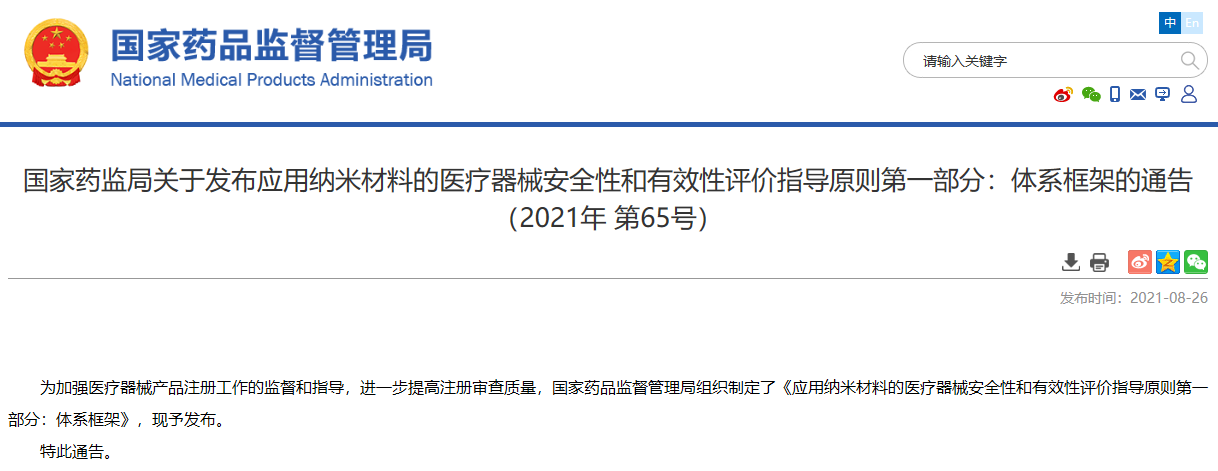 關于發布應用納米材料的醫療器械安全性和有效性評價指導原則第一部分:體系框架的通告(2021年 第65號)