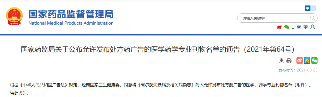 關于公布允許發布處方藥廣告的醫學藥學專業刊物名單的通告(2021年第64號)