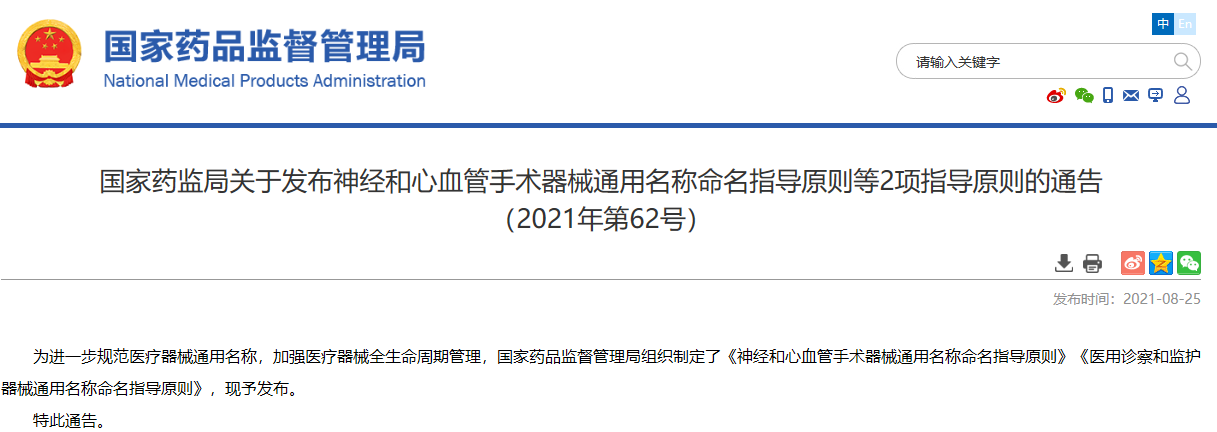 關于發布神經和心血管手術器械通用名稱命名指導原則等2項指導原則的通告(2021年第62號)