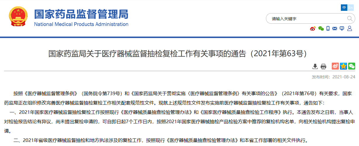 關于醫療器械監督抽檢復檢工作有關事項的通告(2021年第63號)