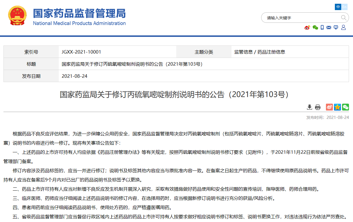 關于修訂丙硫氧嘧啶制劑說明書的公告(2021年第103號)