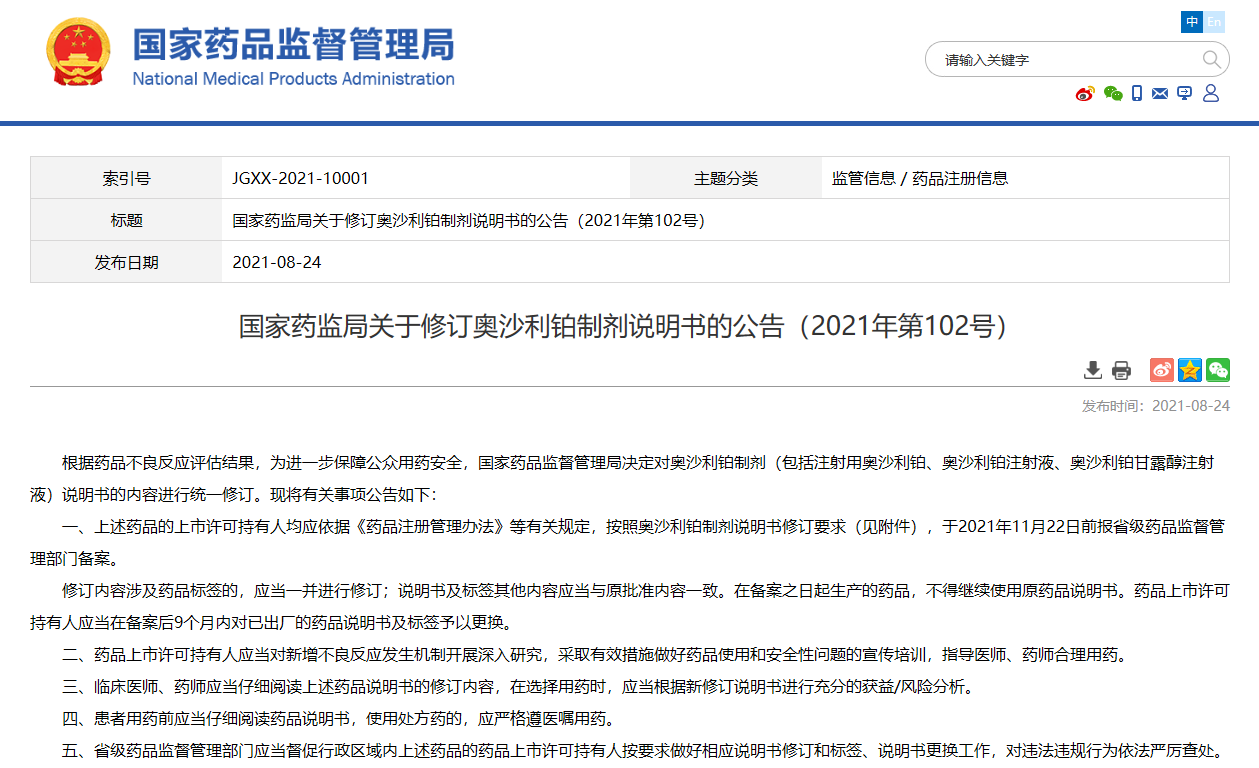 關于修訂奧沙利鉑制劑說明書的公告(2021年第102號)