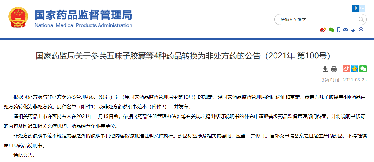 關于參芪五味子膠囊等4種藥品轉換為非處方藥的公告(2021年 第100號)