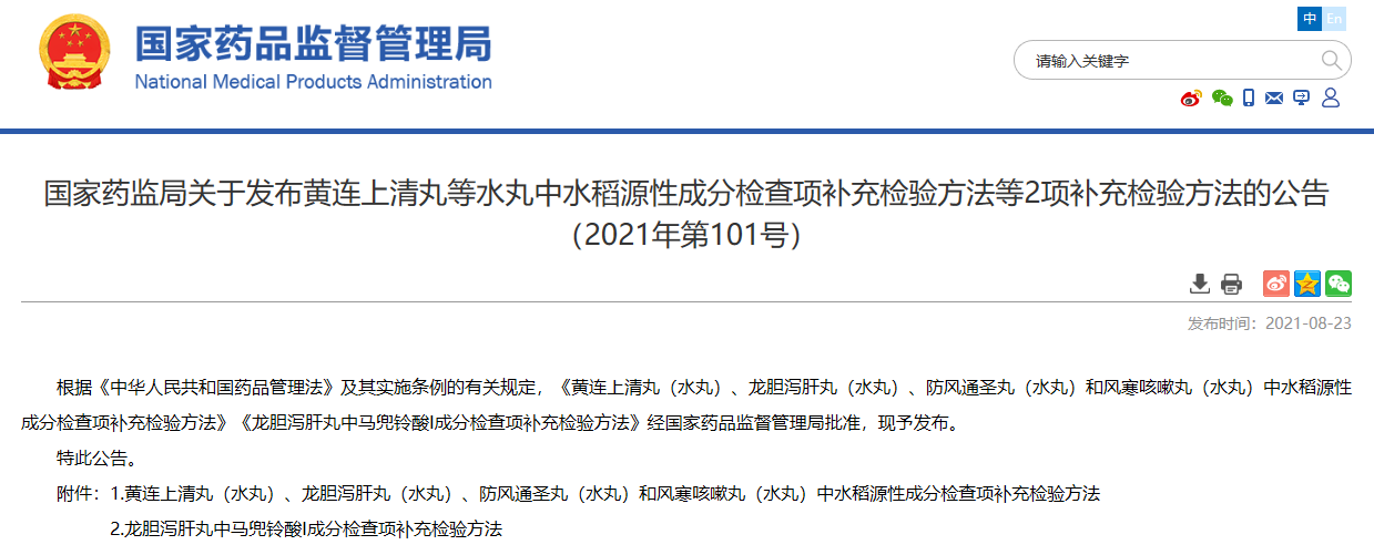 關于發布黃連上清丸等水丸中水稻源性成分檢查項補充檢驗方法等2項補充檢驗方法的公告(2021年第101號)