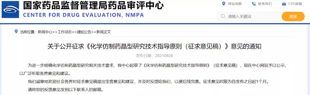 關(guān)于公開(kāi)征求《化學(xué)仿制藥晶型研究技術(shù)指導(dǎo)原則(征求意見(jiàn)稿)》意見(jiàn)的通知