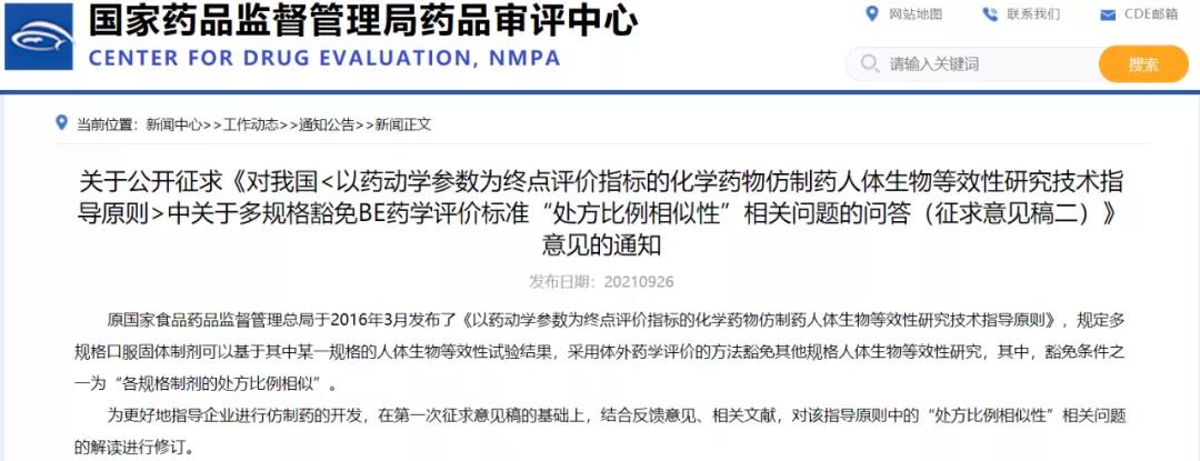 關(guān)于公開(kāi)征求《對(duì)我國(guó)<以藥動(dòng)學(xué)參數(shù)為終點(diǎn)評(píng)價(jià)指標(biāo)的化學(xué)藥物仿制藥人體生物等效性研究技術(shù)指導(dǎo)原則>中關(guān)于多規(guī)格豁免BE藥學(xué)評(píng)價(jià)標(biāo)準(zhǔn)“處方比例相似性”相關(guān)問(wèn)題的問(wèn)答(征求意見(jiàn)稿二)》意見(jiàn)的通知