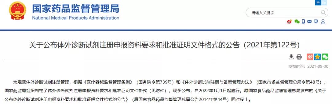 關(guān)于公布體外診斷試劑注冊(cè)申報(bào)資料要求和批準(zhǔn)證明文件格式的公告(2021年第122號(hào))