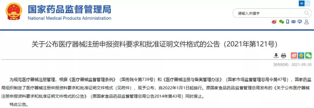 關(guān)于公布醫(yī)療器械注冊(cè)申報(bào)資料要求和批準(zhǔn)證明文件格式的公告(2021年第121號(hào))