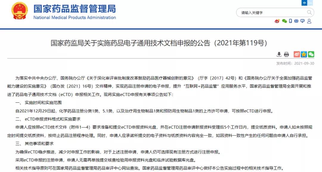 國(guó)家藥監(jiān)局關(guān)于實(shí)施藥品電子通用技術(shù)文檔申報(bào)的公告(2021年第119號(hào))