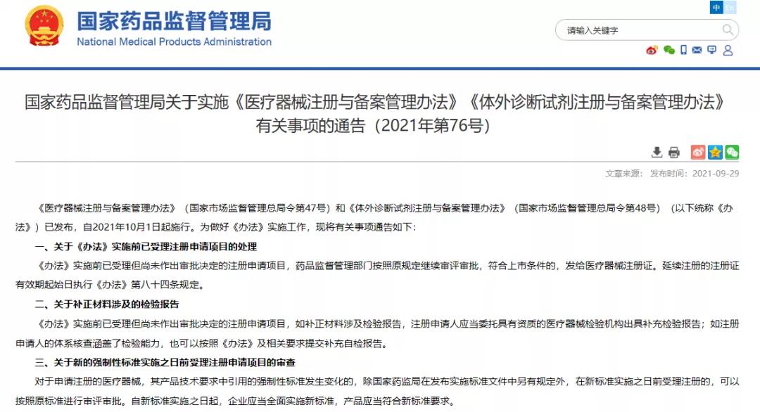 國(guó)家藥品監(jiān)督管理局關(guān)于實(shí)施《醫(yī)療器械注冊(cè)與備案管理辦法》《體外診斷試劑注冊(cè)與備案管理辦法》有關(guān)事項(xiàng)的通告(2021年第76號(hào))