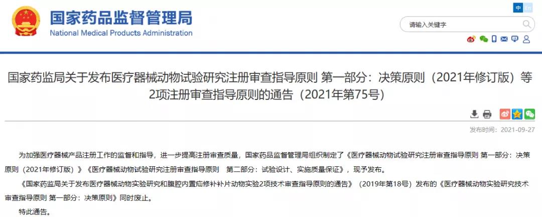 國(guó)家藥監(jiān)局關(guān)于發(fā)布醫(yī)療器械動(dòng)物試驗(yàn)研究注冊(cè)審查指導(dǎo)原則 第一部分:決策原則(2021年修訂版)等2項(xiàng)注冊(cè)審查指導(dǎo)原則的通告(2021年第75號(hào))