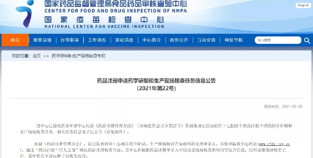 藥品注冊(cè)申請(qǐng)藥學(xué)研制和生產(chǎn)現(xiàn)場(chǎng)核查任務(wù)信息公告(2021年第22號(hào))