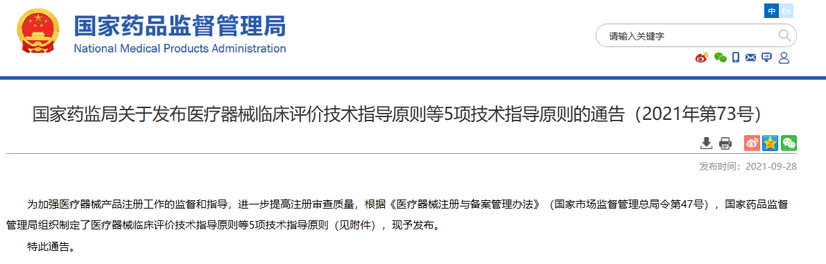 國(guó)家藥監(jiān)局關(guān)于發(fā)布醫(yī)療器械臨床評(píng)價(jià)技術(shù)指導(dǎo)原則等5項(xiàng)技術(shù)指導(dǎo)原則的通告(2021年第73號(hào))