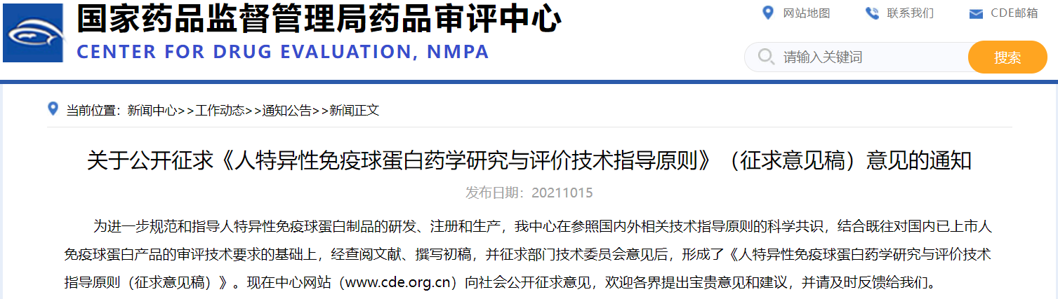 關(guān)于公開征求《人特異性免疫球蛋白藥學(xué)研究與評價(jià)技術(shù)指導(dǎo)原則》(征求意見稿)意見的通知