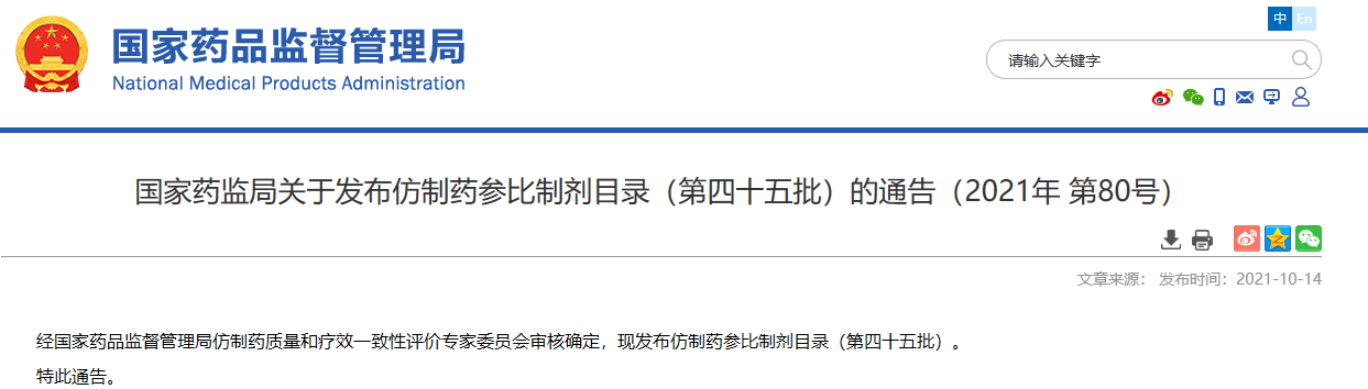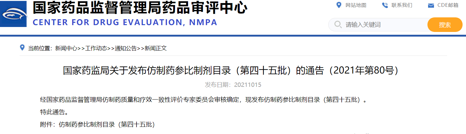 國家藥監(jiān)局關(guān)于發(fā)布仿制藥參比制劑目錄(第四十五批)的通告(2021年第80號(hào))