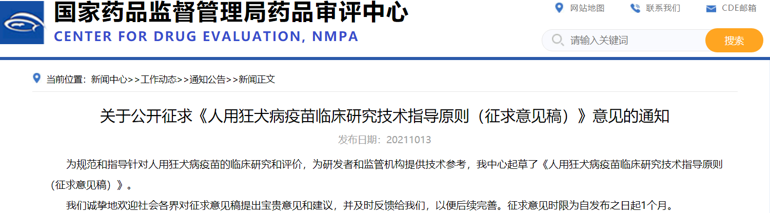 關(guān)于公開征求《人用狂犬病疫苗臨床研究技術(shù)指導(dǎo)原則(征求意見稿)》意見的通知