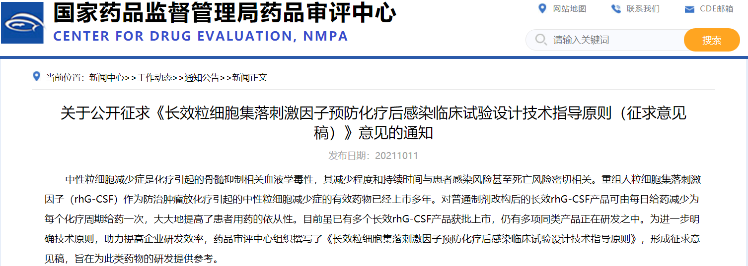 關(guān)于公開征求《長效粒細(xì)胞集落刺激因子預(yù)防化療后感染臨床試驗(yàn)設(shè)計(jì)技術(shù)指導(dǎo)原則(征求意見稿)》意見的通知