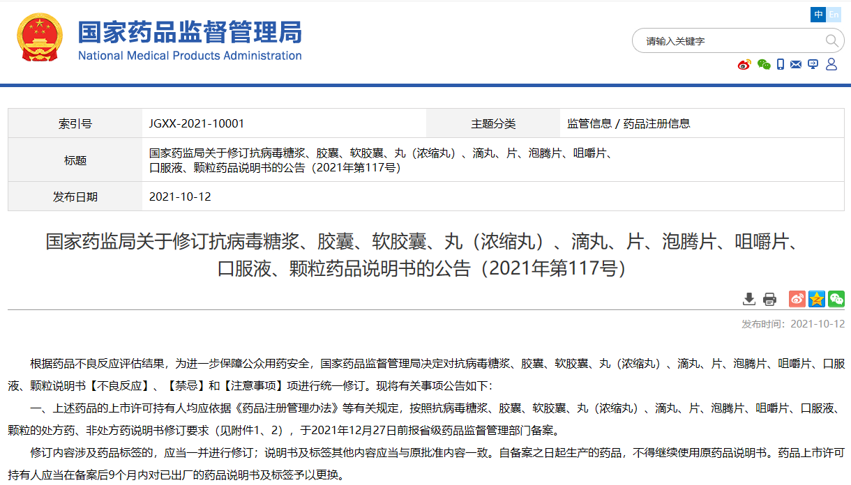 國家藥監(jiān)局關(guān)于修訂抗病毒糖漿、膠囊、軟膠囊、丸(濃縮丸)、滴丸、片、泡騰片、咀嚼片、口服液、顆粒藥品說明書的公告(2021年第117號(hào))