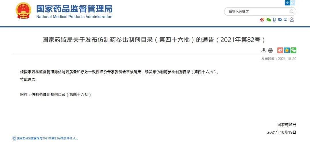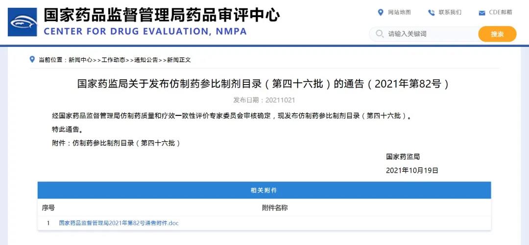 國(guó)家藥監(jiān)局關(guān)于發(fā)布仿制藥參比制劑目錄(第四十六批)的通告(2021年第82號(hào))