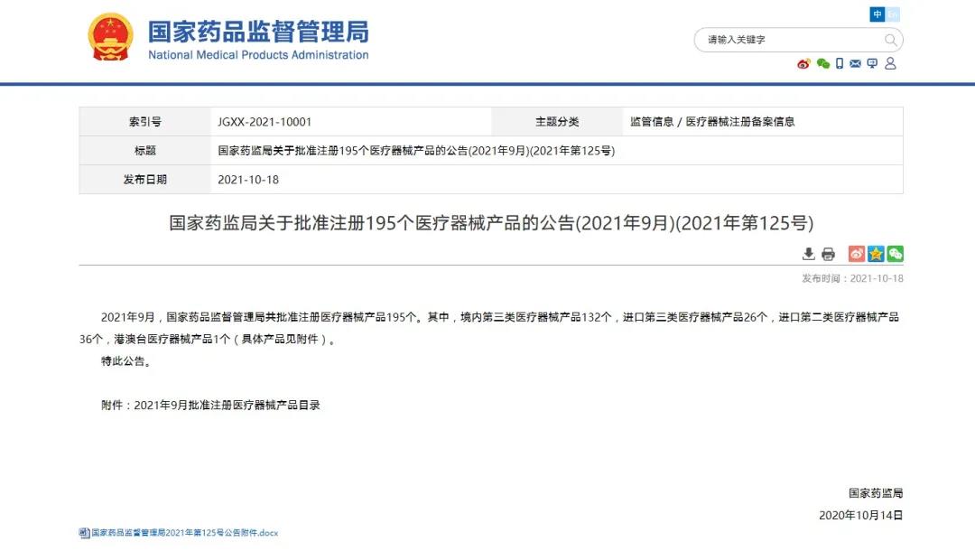 國(guó)家藥監(jiān)局關(guān)于批準(zhǔn)注冊(cè)195個(gè)醫(yī)療器械產(chǎn)品的公告(2021年9月)(2021年第125號(hào))