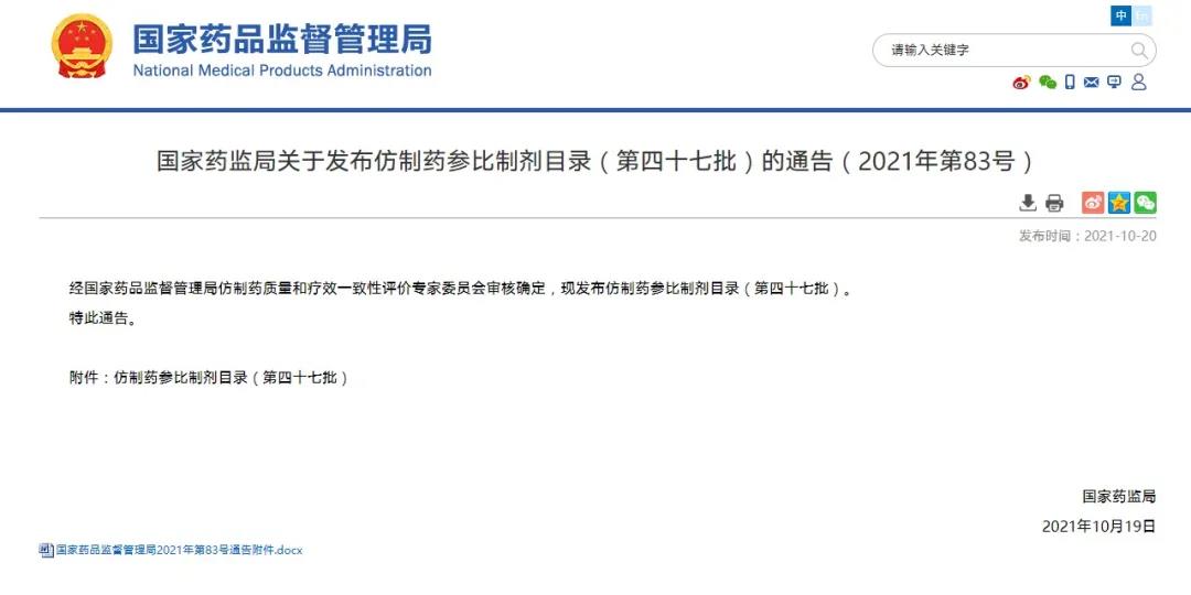國(guó)家藥監(jiān)局關(guān)于發(fā)布仿制藥參比制劑目錄(第四十七批)的通告(2021年第83號(hào))