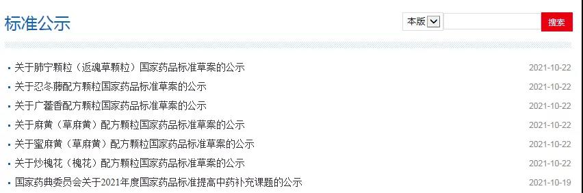 本周肺寧顆粒(返魂草顆粒)、忍冬藤配方顆粒、廣藿香配方顆粒、麻黃(草麻黃)配方顆粒、蜜麻黃(草麻黃)配方顆粒、炒槐花(槐花)配方顆粒國(guó)家藥品標(biāo)準(zhǔn)草案的公示,2021年度國(guó)家藥品標(biāo)準(zhǔn)提高中藥補(bǔ)充課題公示。
