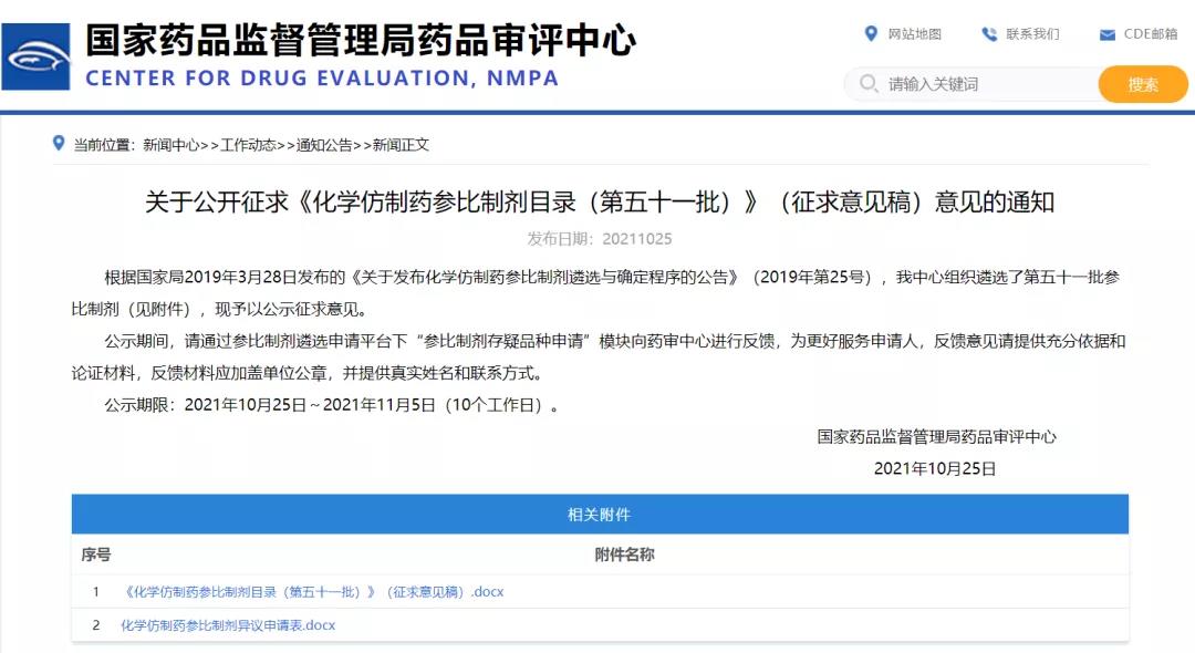 關于公開征求《化學仿制藥參比制劑目錄(第五十一批)》(征求意見稿)意見的通知