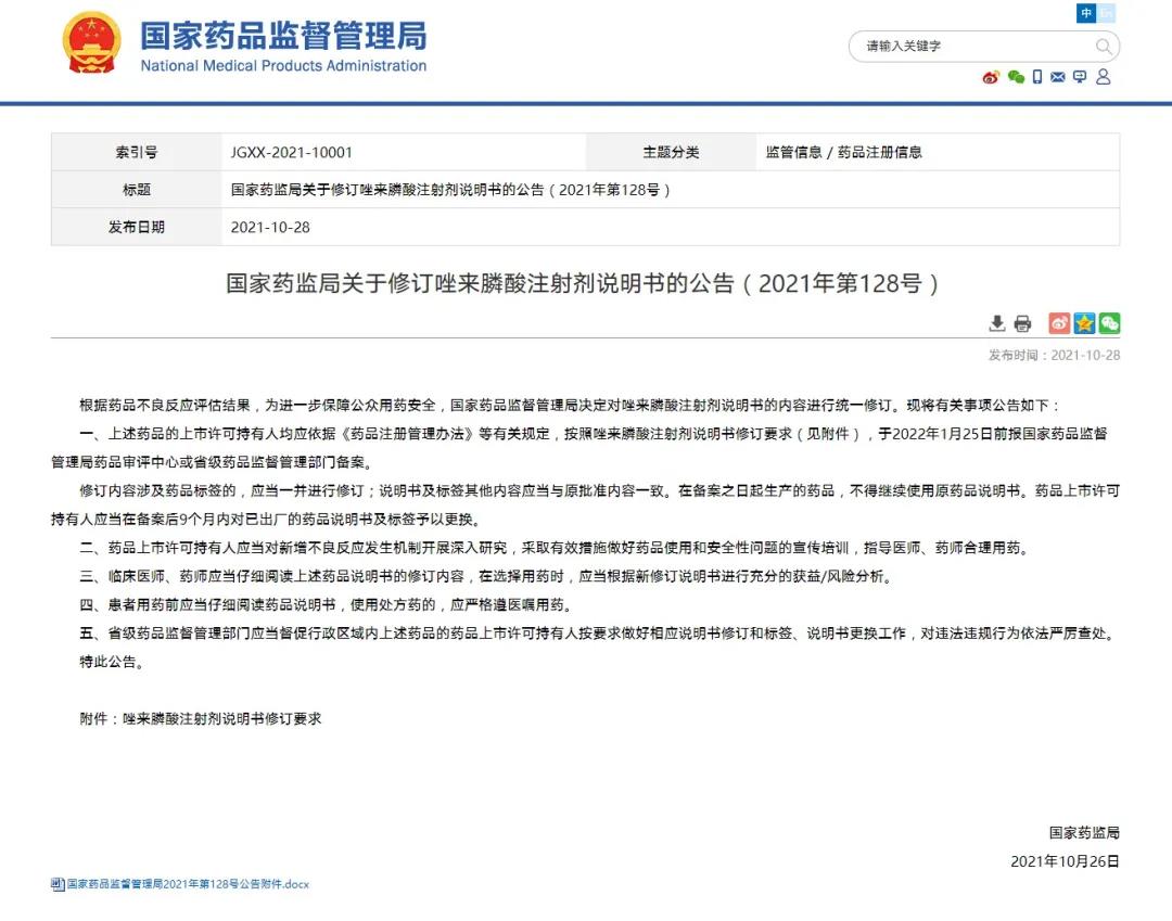國家藥監局關于修訂唑來膦酸注射劑說明書的公告(2021年第128號)