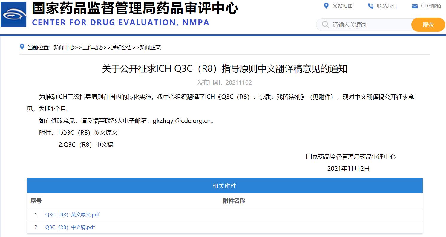 關于公開征求ICH Q3C(R8)指導原則中文翻譯稿意見的通知