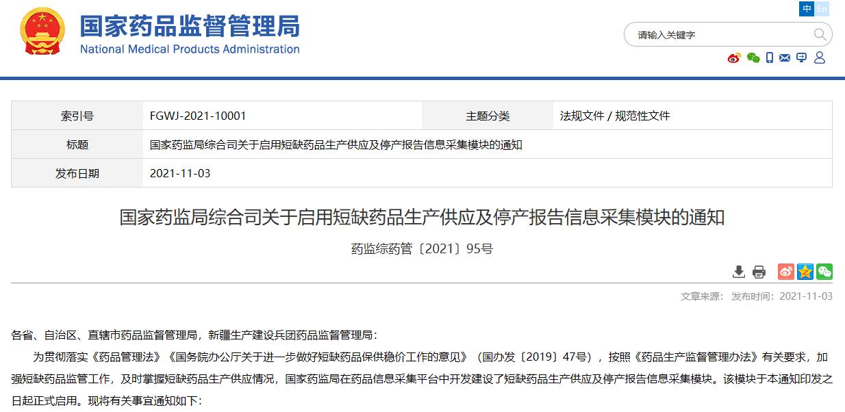 國家藥監局綜合司關于啟用短缺藥品生產供應及停產報告信息采集模塊的通知