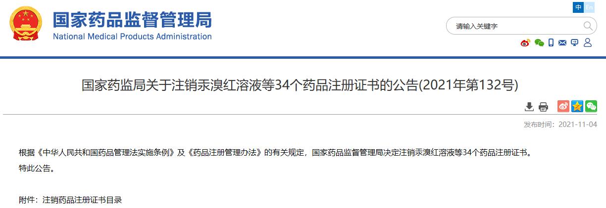 國家藥監局關于注銷汞溴紅溶液等34個藥品注冊證書的公告(2021年第132號)