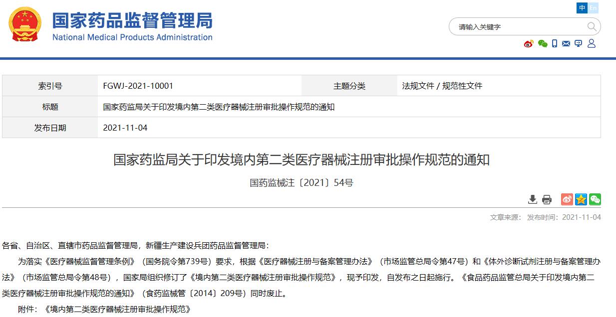 國家藥監局關于印發境內第二類醫療器械注冊審批操作規范的通知