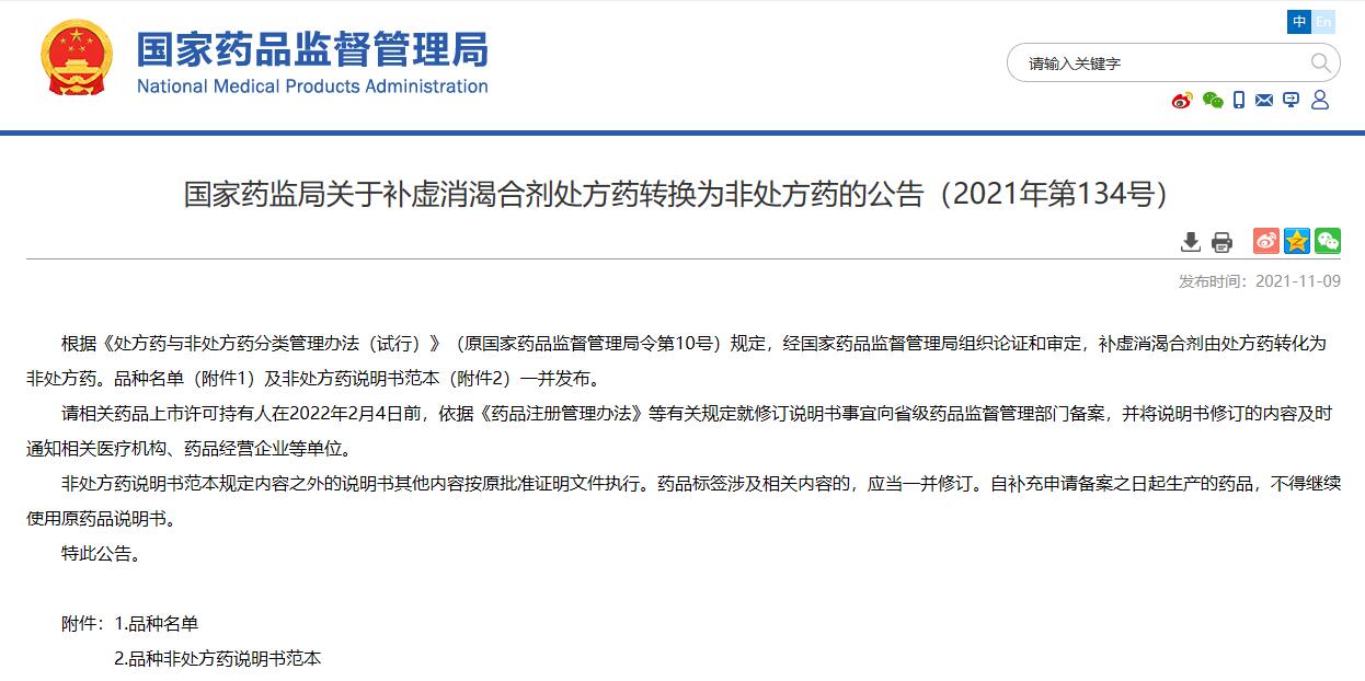 國家藥監(jiān)局關(guān)于補(bǔ)虛消渴合劑處方藥轉(zhuǎn)換為非處方藥的公告(2021年第134號(hào))