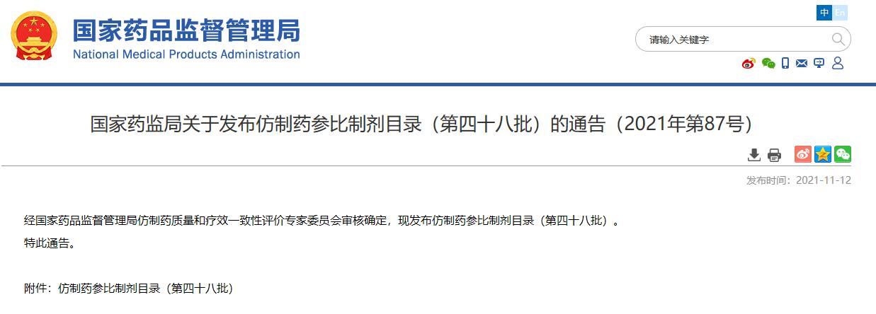 國家藥監(jiān)局關(guān)于發(fā)布仿制藥參比制劑目錄(第四十八批)的通告(2021年第87號(hào))
