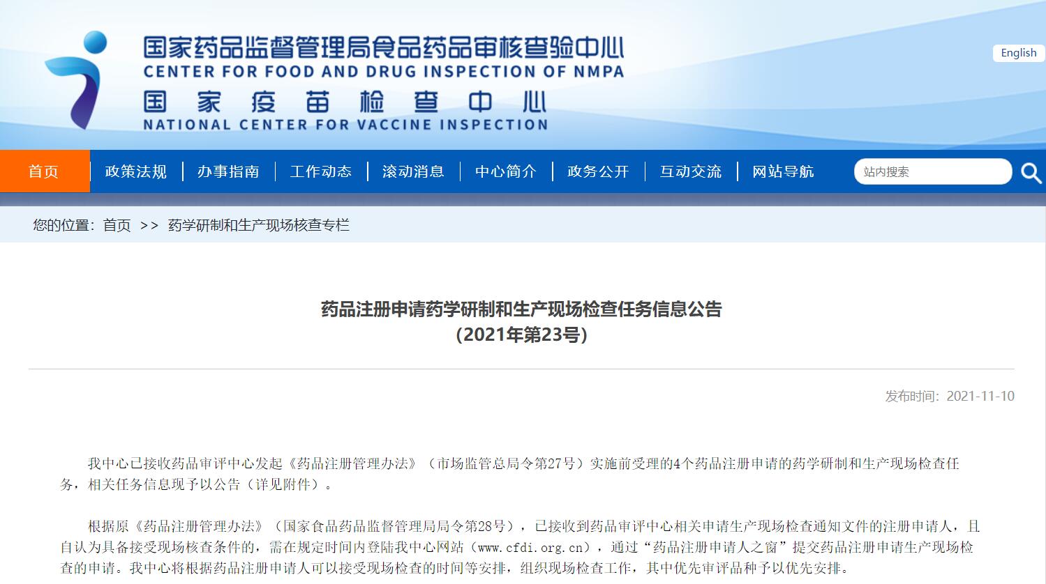 藥品注冊(cè)申請(qǐng)藥學(xué)研制和生產(chǎn)現(xiàn)場(chǎng)檢查任務(wù)信息公告(2021年第23號(hào))