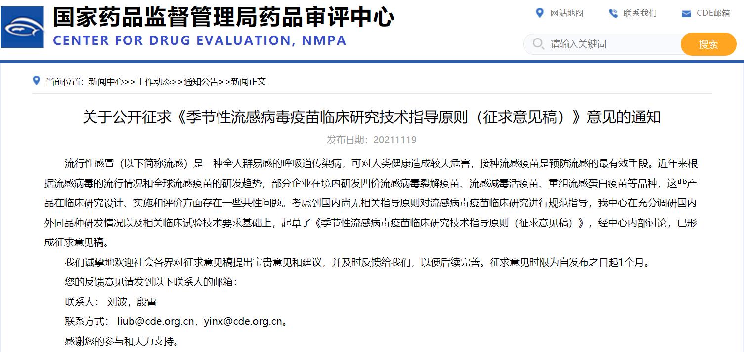 關于公開征求《季節性流感病毒疫苗臨床研究技術指導原則(征求意見稿)》意見的通知