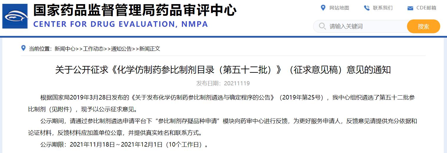 關于公開征求《化學仿制藥參比制劑目錄(第五十二批)》(征求意見稿)意見的通知