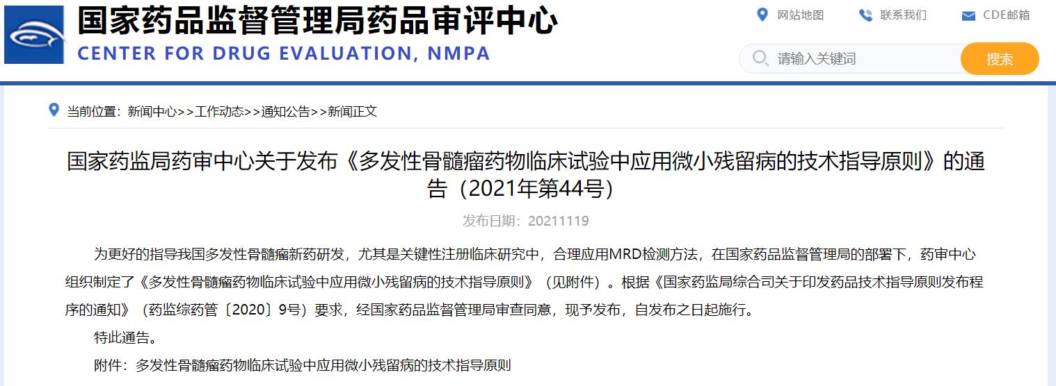 國家藥監局藥審中心關于發布《多發性骨髓瘤藥物臨床試驗中應用微小殘留病的技術指導原則》的通告(2021年第44號)