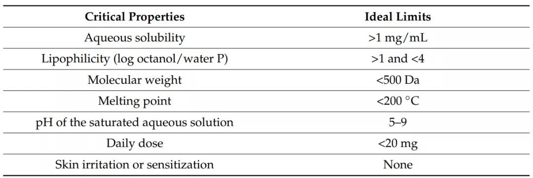 如圖3所示,一般來講,要求原料藥水溶性大于1毫克每毫升,分子量小于500,熔點小于200攝氏度,并且其飽和溶解度pH落在5-9之間,每日最大給藥劑量不超過20毫克,且原料藥本身不對皮膚產生任何致敏作用[4]。