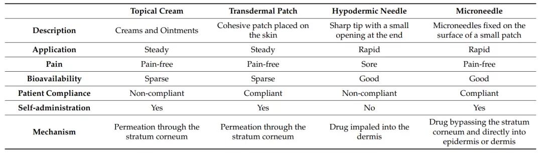 相比傳統的口服和注射給藥方式,透皮給藥能夠避免毒副作用,能在較長時間內保持血液中的藥物濃度,避免肝臟的首過效應,從而提高生物利用度,適用特殊人群,特別適用于嬰兒、老人和吞咽困難患者,安全、方便,若發生不良反應,只需剝離即可中斷給藥。并且可以實現避免多次給藥造成漏服的情形,一次貼劑可以維持很久的治療作用。但我們也可以在圖2中看到,透皮制劑也常常有皮膚過敏或者血藥濃度低等缺點,開發適合透皮制劑給藥品種具有一定難度[3]。