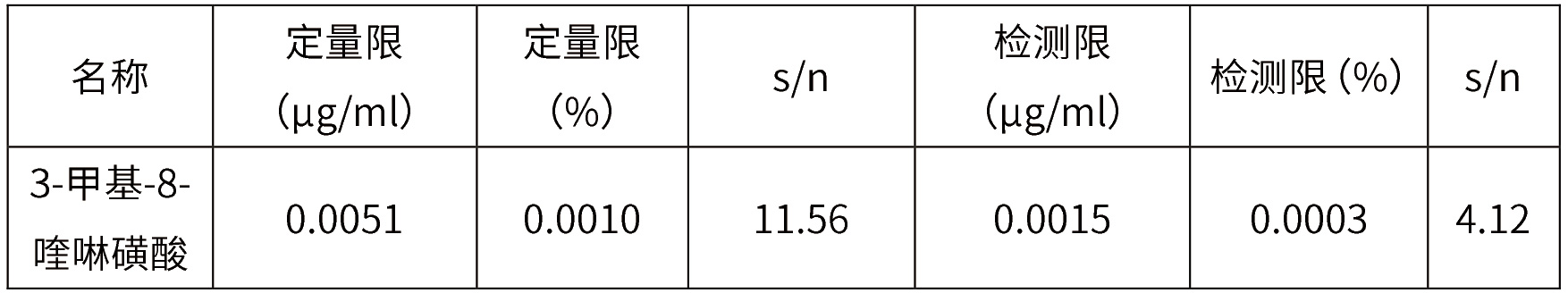 結論:3-甲基-8-喹啉磺酸定量限小于報告限度(0.05%)的50%,檢測限小于定量限的0.5倍,方法靈敏度符合要求。