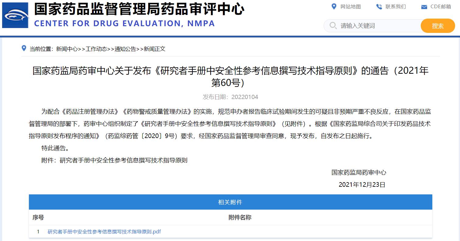 國家藥監局藥審中心關于發布《研究者手冊中安全性參考信息撰寫技術指導原則》的通告(2021年第60號)