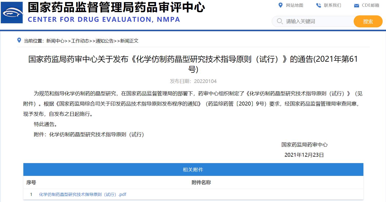 國家藥監局藥審中心關于發布《化學仿制藥晶型研究技術指導原則(試行)》的通告(2021年第61號)