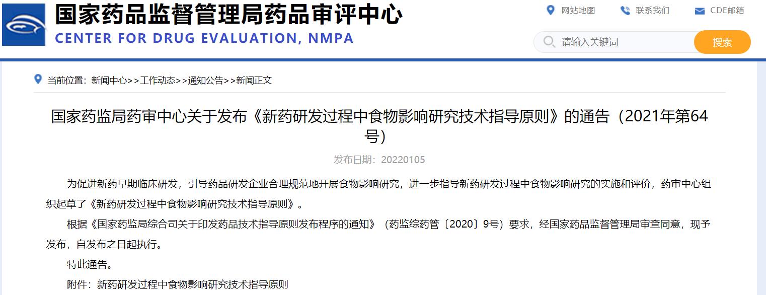 國家藥監局藥審中心關于發布《新藥研發過程中食物影響研究技術指導原則》的通告(2021年第64號)