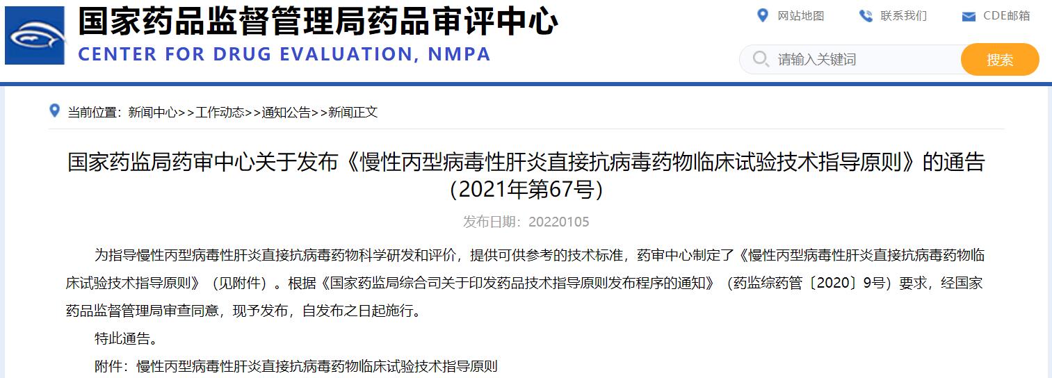 國家藥監局藥審中心關于發布《慢性丙型病毒性肝炎直接抗病毒藥物臨床試驗技術指導原則》的通告(2021年第67號)