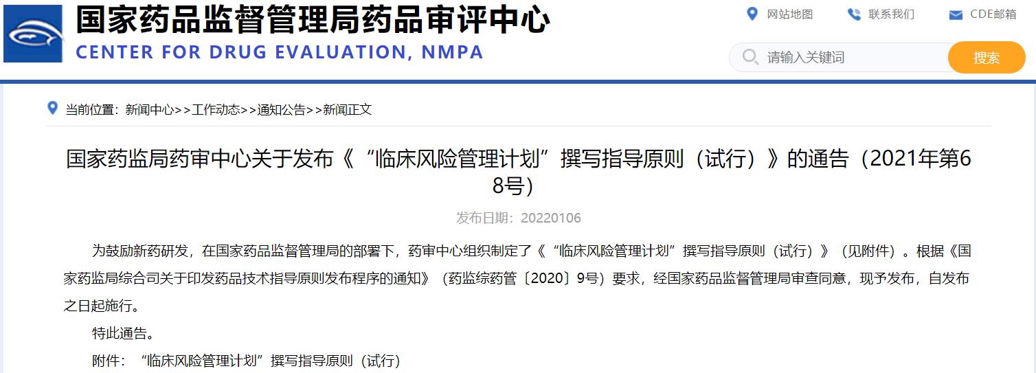 國家藥監局藥審中心關于發布《“臨床風險管理計劃”撰寫指導原則(試行)》的通告(2021年第68號)