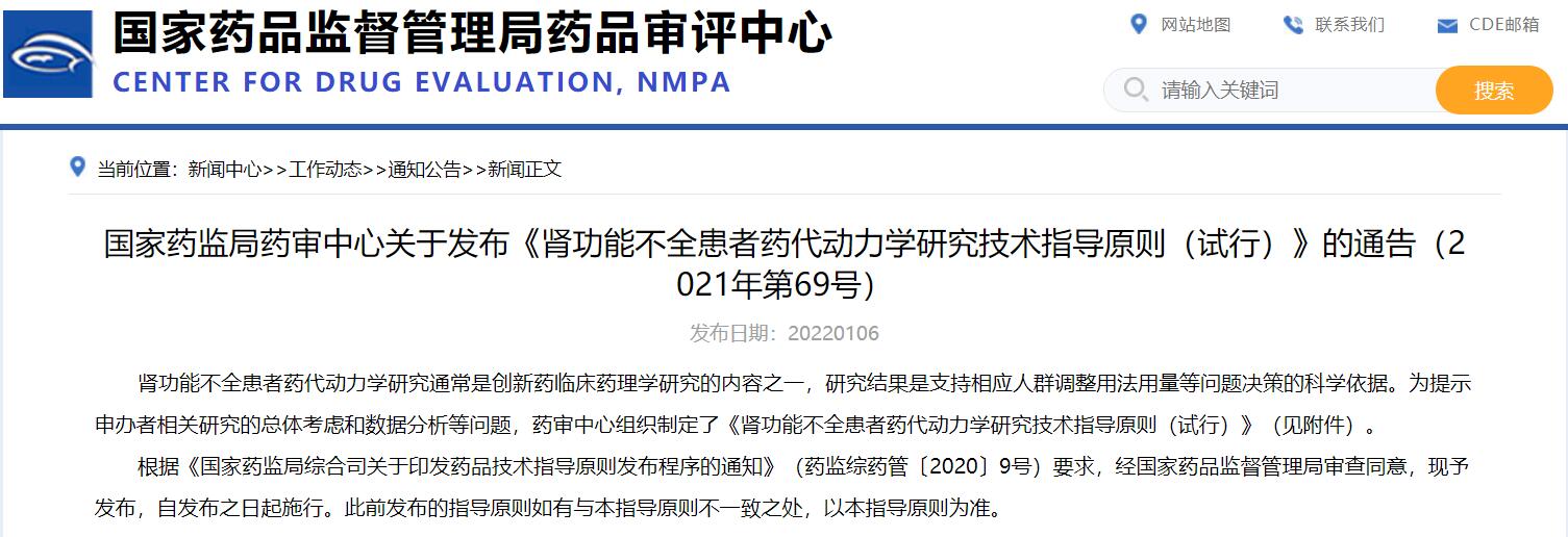 國家藥監局藥審中心關于發布《腎功能不全患者藥代動力學研究技術指導原則(試行)》的通告(2021年第69號)