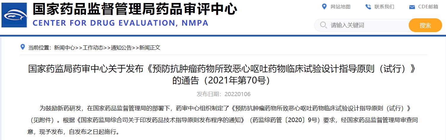 國家藥監局藥審中心關于發布《預防抗腫瘤藥物所致惡心嘔吐藥物臨床試驗設計指導原則(試行)》的通告(2021年第70號)