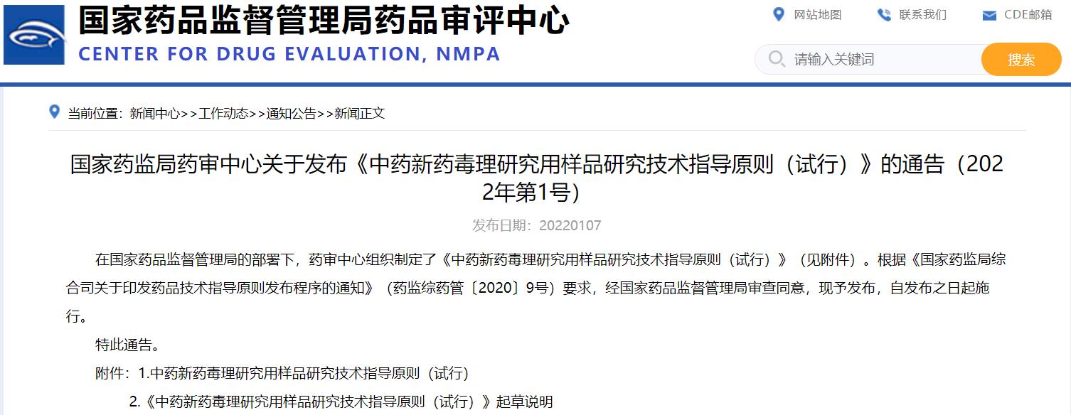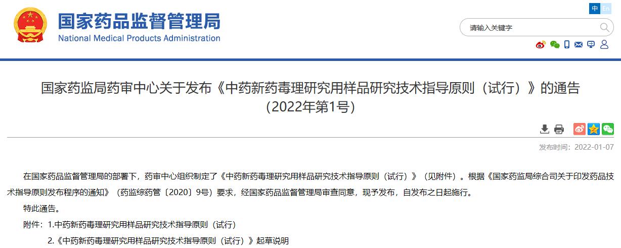 國家藥監局藥審中心關于發布《中藥新藥毒理研究用樣品研究技術指導原則(試行)》的通告(2022年第1號)