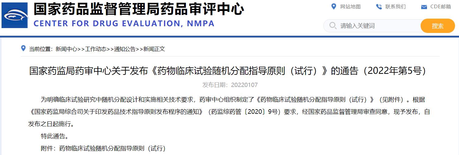 國家藥監局藥審中心關于發布《藥物臨床試驗隨機分配指導原則(試行)》的通告(2022年第5號)